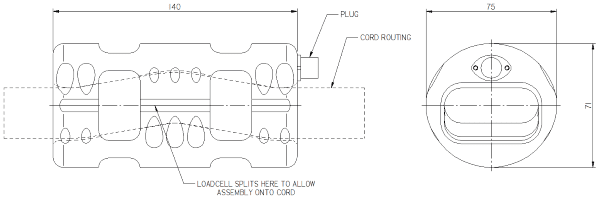 The loadcell could be assembled around the cord such that there was no need to de-tension or decouple the cord and no need to manufacture special end terminations. Two versions were manufactured for different sizes of rope. The total mass of the 50,000lbf sensor was no more than 1.25kg, with an overall diameter no more than 50% larger than the cord itself.