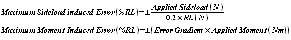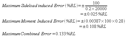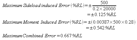 These formulae work together in parallel such that, for this particular loadcell, a sideload of 800N applied at a moment arm of 500mm would give a combined maximum error of 0.384% RL