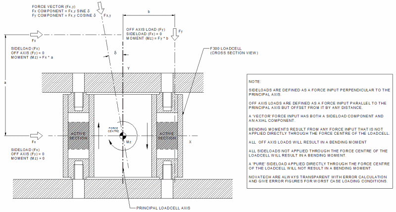 Moments can be particularly detrimental in force measurement and will often heavily influence the output from a standard bridge circuit. Worse still, it is possible to have a large moment without being fully aware of the extent of the problem, as even a small sideload at a reasonable distance can cause a sizeable moment. For this reason, it is desirable to have known and predictable behaviour with respect to applied sideloads and moments. Where these characteristics are given for a Novatech product, the moment itself has been induced by a sideload rather than an off axis load. This is the more extreme application and is therefore the most useful and honest way to present the error. It should be noted that it is increasingly common with other manufacturers for error values to be given in terms of moments induced by off axis loads, as this makes any errors look smaller.