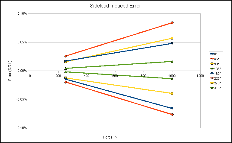 The graphs show that the sideload induced error is less significant when compared to the moment induced error and that the loadcell is generally extremely good at rejecting sideloads. An apparently large variation is seen between one orientation and the next, although this is in fact a ±0.08% RL variation across a full 360° sweep and is due to acceptable gauge positioning and machining tolerances. This variation is naturally amplified by moment effects. Even so, the moment induced error is both extremely linear and reversible, such that errors for 0° and 180°, for example, are equal and opposite. This allows the maximum errors to be expressed using y = mx + c where c = 0.